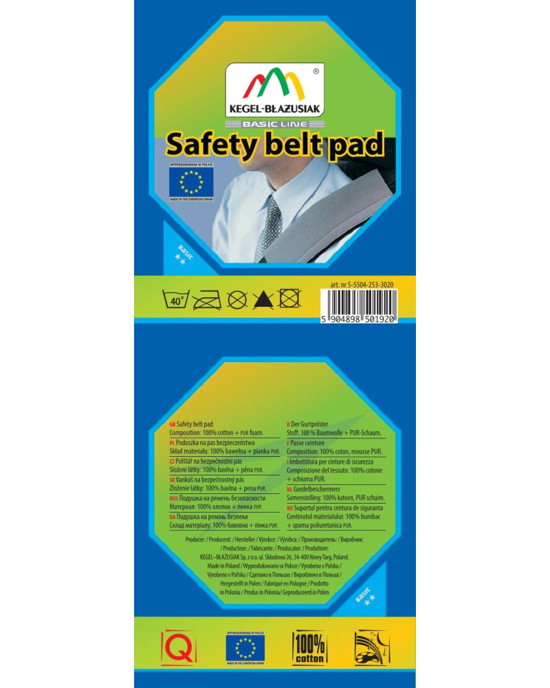 Installation is very simple – the cushion is attached to the seat belts with Velcro. It significantly improves travel comfort by preventing the belt from digging into the body. The functionality of the cushion will be appreciated especially by those travelling long distances. Thanks to the pleasant material, which is gentle on the skin, and the filling made of soft PUR foam, the cushion is very comfortable – it allows you to rest your tired head and makes it easier to sleep. Your children will be delighted. The cushion is made of cotton and comes in many colours (blue, red, green, grey and yellow). The colours are deep and intense, yet not garish, but slightly subdued. SAFETY BELT PAD is a cool, inexpensive accessory that enriches the interior of your car and adds colour to it. The product is very easy to clean – it can be washed at 40°C without any worries. This product is part of the BASIC LINE series, whose motto is "very good quality at an affordable price." It is manufactured from high-quality raw materials. Covers from this brand meet all strength and quality standards. Their careful workmanship and high-quality materials make them perfect for the automotive industry.