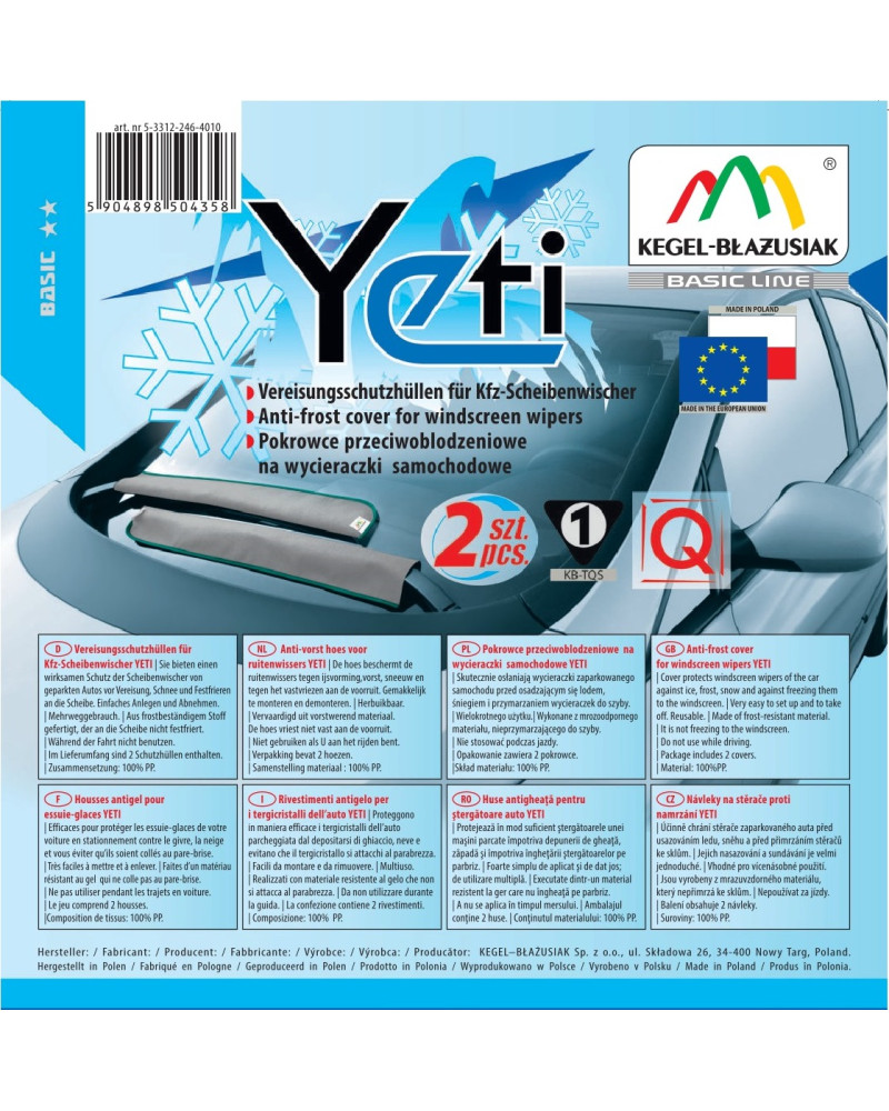 Extremely useful YETI anti-icing covers for car windscreen wipers. They effectively protect the wipers of a parked car from ice and snow build-up. They prevent the wipers from freezing to the windscreen and thus prevent damage that could occur when they are pulled off violently. They will save you a lot of time and energy "scraping" ice or frozen snow off the wipers and pulling them off the windscreen. Very easy to put on and take off (to put them on, simply slide them over the wiper blades, and to remove them, slide them back the other way). Made of high-quality SPUNBOND material - very strong, durable and, above all, resistant to freezing. The covers protect the relevant parts of your car and provide you with comfort and convenience. High quality at a really low price.