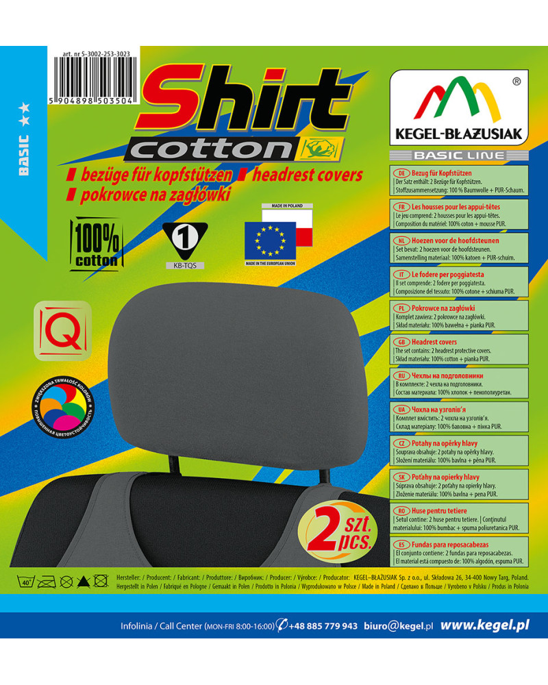 Natural cotton on the outside makes the covers very pleasant and body-friendly, and they do not generate static electricity. In addition, the cotton fabric is dyed using modern methods and dyes from reputable manufacturers, which makes it more resistant to colour loss due to sunlight and washing than other cotton products. The covers can be safely washed at 40° - in accordance with the instructions on the packaging. COTTON covers also have the necessary, appropriately sized openings, allowing them to be fitted without having to remove the headrests and make additional openings. The set comes with special plastic clips and fasteners sewn into the fabric, which, with the help of the included illustrated instructions, ensures very easy installation. A product from the BASIC LINE series, whose motto is – very good quality at an affordable price. Manufactured from high-quality raw materials. Covers from this brand meet all strength and quality standards. Their careful workmanship and high-quality materials make them ideal for the automotive industry.