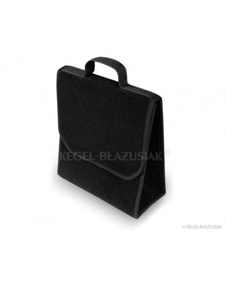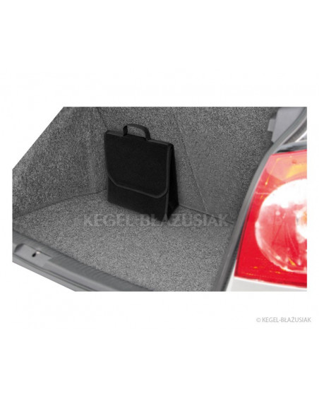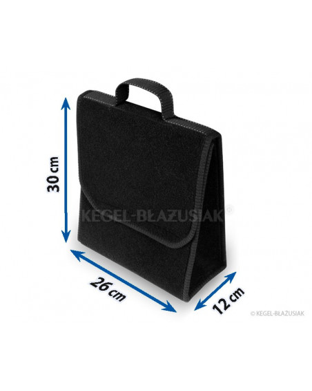 Niezwykle praktyczna torba do bagażnika, wykonana z powtarzalnego materiału dywanowego z mocnymi rzepami od spodu i na tylnej ścianie torby, pozwoli na przechowywanie wielu przedmiotów – nawet tych ciężkich i ostrych. Pomoże utrzymać porządek we wnętrzu samochodu; zabezpieczy przedmioty oraz wnętrze bagażnika przed możliwym uszkodzeniem. Ma poręczny, pionowy kształt umożliwiający przechowanie pięciolitrowego pojemnika z olejem silnikowym lub płynem do spryskiwaczy lub gaśnicy kilowej oraz innych potrzebnych w samochodzie narzędzi, kompletu żarówek, akcesoriów itp. Dzięki mocnym dużym rzepom, biegnącym przez całą długość torby dobrze trzyma się wykładziny bagażnika. Jest bardzo pojemna. Posiada „wieko” zapinane na rzepę z możliwością regulacji. Nie zajmuje dużo miejsca. Dzięki uchwytowi łatwo można ją przenosić. Zrobiona w kolorze czarnym, charakteryzuje się zarówno niezwykłą funkcjonalnością jak i eleganckim wyglądem.
