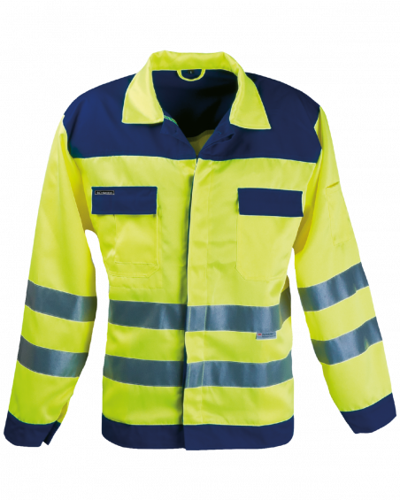 • Podwójne pasy taśmy odblaskowej o  szer. 5 cm na korpusie i rękawach.