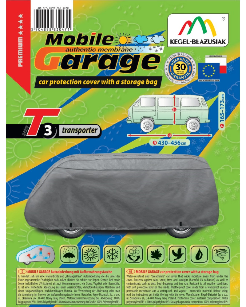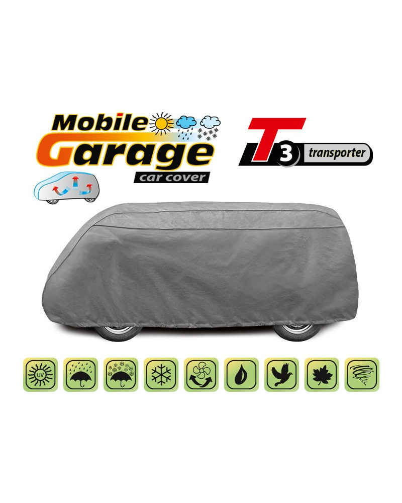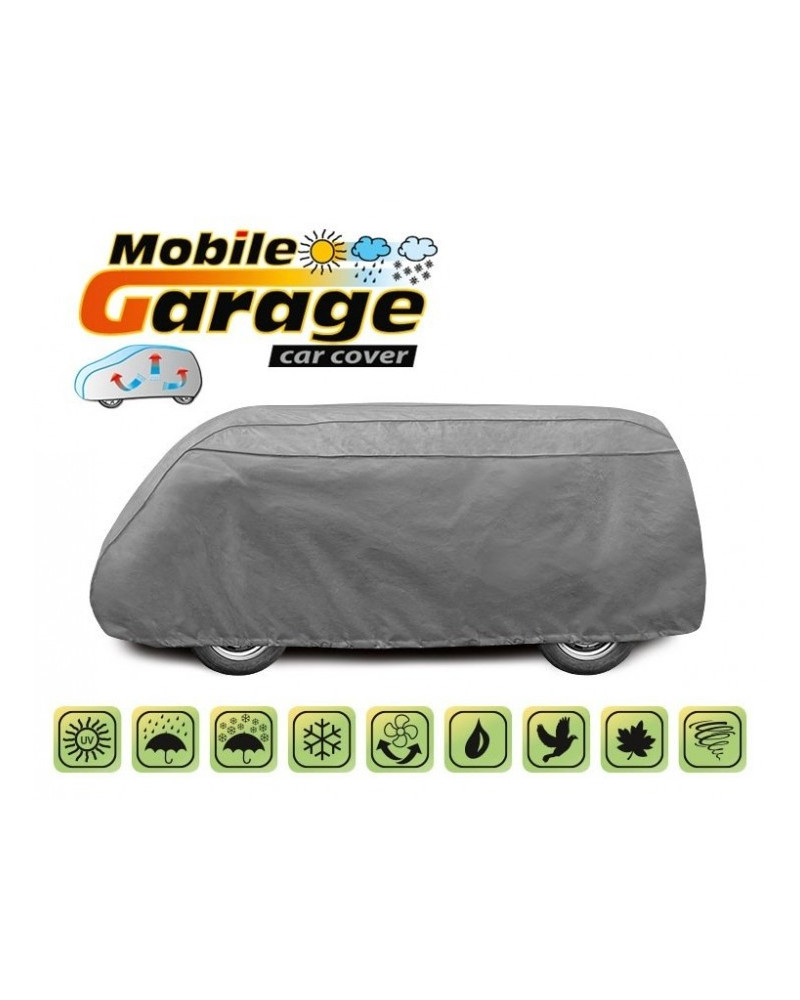 Wysokogatunkowy pokrowiec Mobile Garage na kamper van to produkt dopasowany do potrzeb kierowców. Pokrowiec wykonany jest z aż 4-warstwowego materiału, który jest gruby, mocny i wytrzymały. Pokrowiec chroni cały kamper przed szkodliwym wpływem środowiska. Pokrowiec Mobile Garage to odpowiednia ochrona kampera przez cały rok. Jego funkcjonalność docenić można w każdej porze roku. W sezonie zimowym zapobiega osadzaniu się śniegu, szronu i lodu, a także jest odporny na przymarzanie; na jesieni chroni przed deszczem, wiatrem, liśćmi, sokami z drzew; zaś w porach letnich i wiosennych ochrania przed promieniami UV, pyłem i ptasimi odchodami.