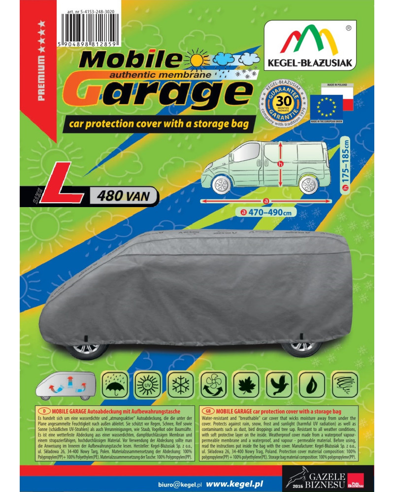 Wysokogatunkowy pokrowiec Mobile Garage na kamper van, półintegra to produkt dopasowany do potrzeb kierowców. Pokrowiec wykonany jest z aż 4-warstwowego materiału, który jest gruby, mocny i wytrzymały. Pokrowiec chroni cały kamper przed szkodliwym wpływem środowiska. Pokrowiec Mobile Garage to odpowiednia ochrona kampera przez cały rok. Jego funkcjonalność docenić można w każdej porze roku. W sezonie zimowym zapobiega osadzaniu się śniegu, szronu i lodu, a także jest odporny na przymarzanie; na jesieni chroni przed deszczem, wiatrem, liśćmi, sokami z drzew; zaś w porach letnich i wiosennych ochrania przed promieniami UV, pyłem i ptasimi odchodami.