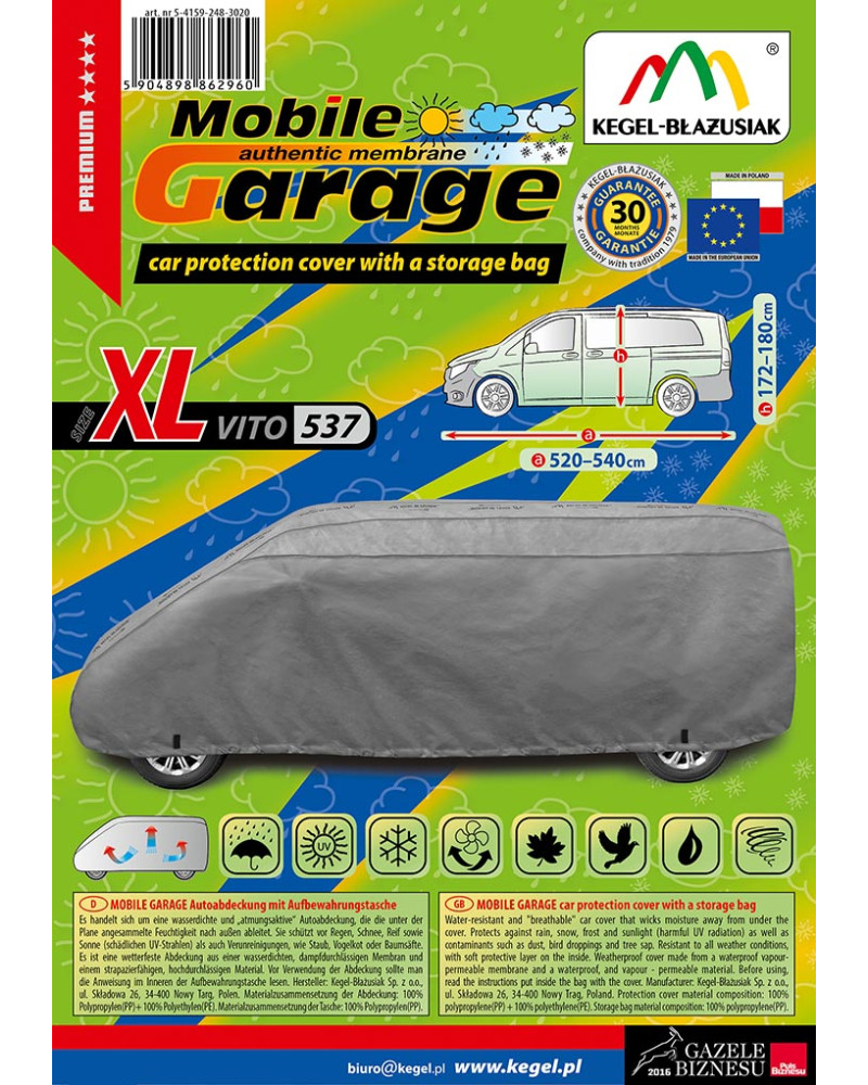Wysokogatunkowy pokrowiec Mobile Garage na kamper van to produkt dopasowany do potrzeb kierowców. Pokrowiec wykonany jest z aż 4-warstwowego materiału, który jest gruby, mocny i wytrzymały. Pokrowiec chroni cały kamper przed szkodliwym wpływem środowiska. Pokrowiec Mobile Garage to odpowiednia ochrona kampera przez cały rok. Jego funkcjonalność docenić można w każdej porze roku. W sezonie zimowym zapobiega osadzaniu się śniegu, szronu i lodu, a także jest odporny na przymarzanie; na jesieni chroni przed deszczem, wiatrem, liśćmi, sokami z drzew; zaś w porach letnich i wiosennych ochrania przed promieniami UV, pyłem i ptasimi odchodami.