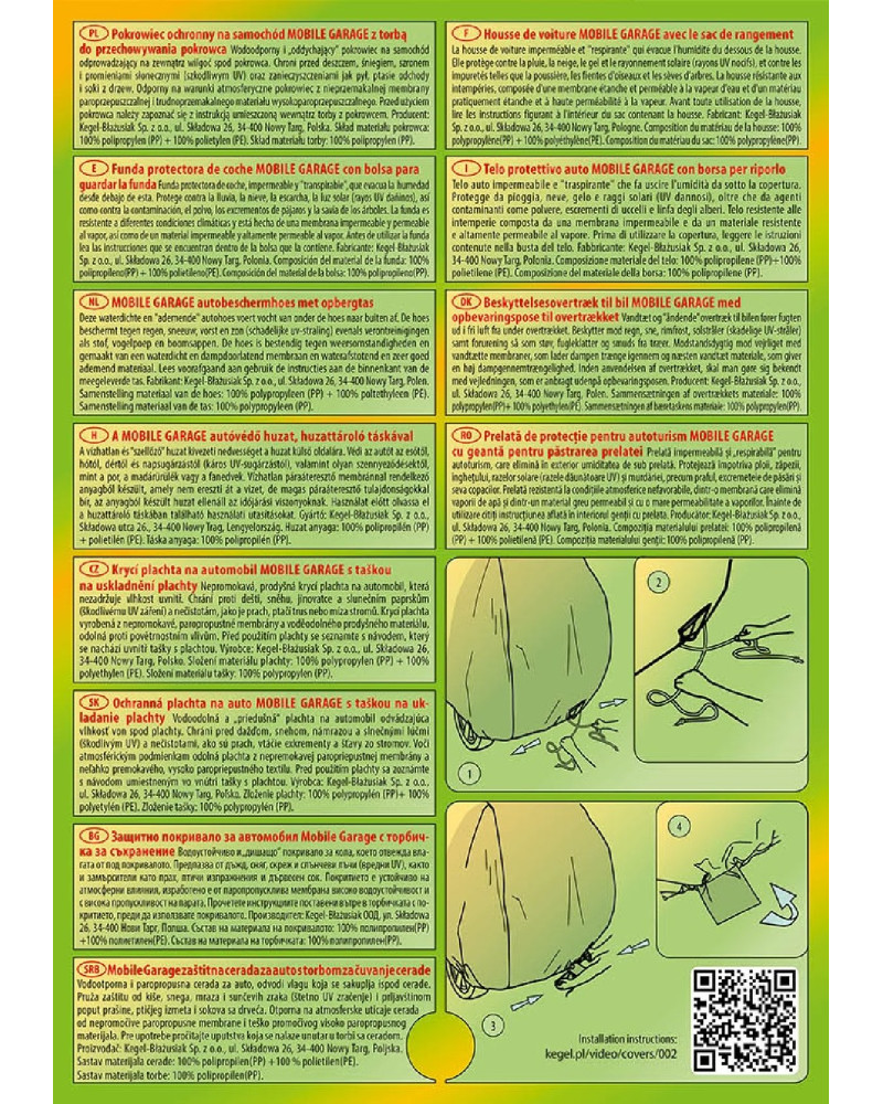 Wysokogatunkowy pokrowiec Mobile Garage na kamper van, półintegra to produkt dopasowany do potrzeb kierowców. Pokrowiec wykonany jest z aż 4-warstwowego materiału, który jest gruby, mocny i wytrzymały. Pokrowiec chroni cały kamper przed szkodliwym wpływem środowiska. Pokrowiec Mobile Garage to odpowiednia ochrona kampera przez cały rok. Jego funkcjonalność docenić można w każdej porze roku. W sezonie zimowym zapobiega osadzaniu się śniegu, szronu i lodu, a także jest odporny na przymarzanie; na jesieni chroni przed deszczem, wiatrem, liśćmi, sokami z drzew; zaś w porach letnich i wiosennych ochrania przed promieniami UV, pyłem i ptasimi odchodami.