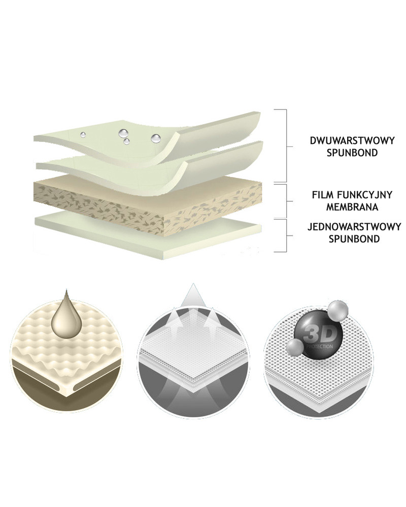 The sides of the cover are double-layered, made of double-layer SPUNBOND non-woven fabric. The sides of the cover are highly vapour-permeable and very water-resistant.