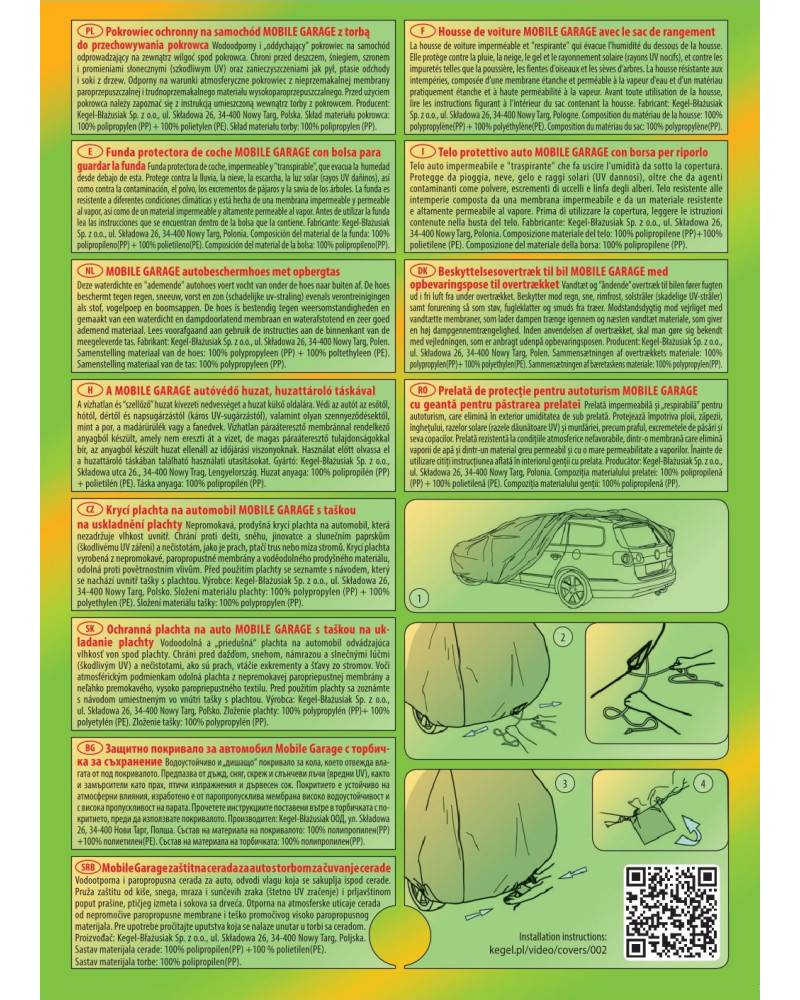 Before fitting the cover to the car, fold down the side mirrors and fold or unscrew the aerial. Place the cover on a clean and dry car with the printed side facing outwards. To facilitate the right positioning of the cover on the vehicle, the label marked “ FRONT” has been sewn into the cover on the front and the label marked “REAR” into the back of the cover (the markings correspond to the front and back of the vehicle)