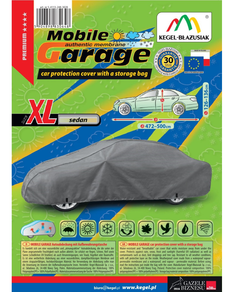 The high-quality Mobile Garage cover is a product tailored to the needs of drivers. The cover is made of a 4-layer material that is thick, strong, and durable. The cover protects the entire car from harmful environmental influences. The Mobile Garage cover provides adequate protection for your vehicle throughout the year. Its functionality can be appreciated in every season. In winter, it prevents snow, frost, and ice from settling on the car and is resistant to freezing; in autumn, it protects against rain, wind, leaves, and tree sap; and in summer and spring, it protects against UV rays, dust, and bird droppings.