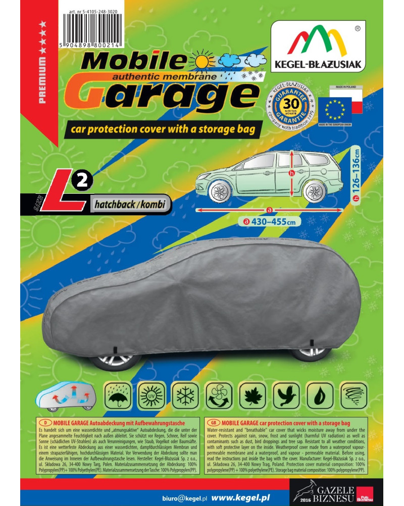 The high-quality Mobile Garage cover is a product tailored to the needs of drivers. The cover is made of a 4-layer material that is thick, strong, and durable. The cover protects the entire car from harmful environmental influences. The Mobile Garage cover provides adequate protection for your vehicle throughout the year. Its functionality can be appreciated in every season. In winter, it prevents snow, frost, and ice from settling on the car and is resistant to freezing; in autumn, it protects against rain, wind, leaves, and tree sap; and in summer and spring, it protects against UV rays, dust, and bird droppings.