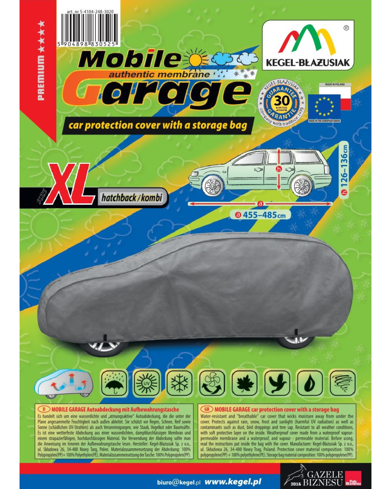 The high-quality Mobile Garage cover is a product tailored to the needs of drivers. The cover is made of a 4-layer material that is thick, strong, and durable. The cover protects the entire car from harmful environmental influences. The Mobile Garage cover provides adequate protection for your vehicle throughout the year. Its functionality can be appreciated in every season. In winter, it prevents snow, frost, and ice from settling on the car and is resistant to freezing; in autumn, it protects against rain, wind, leaves, and tree sap; and in summer and spring, it protects against UV rays, dust, and bird droppings.