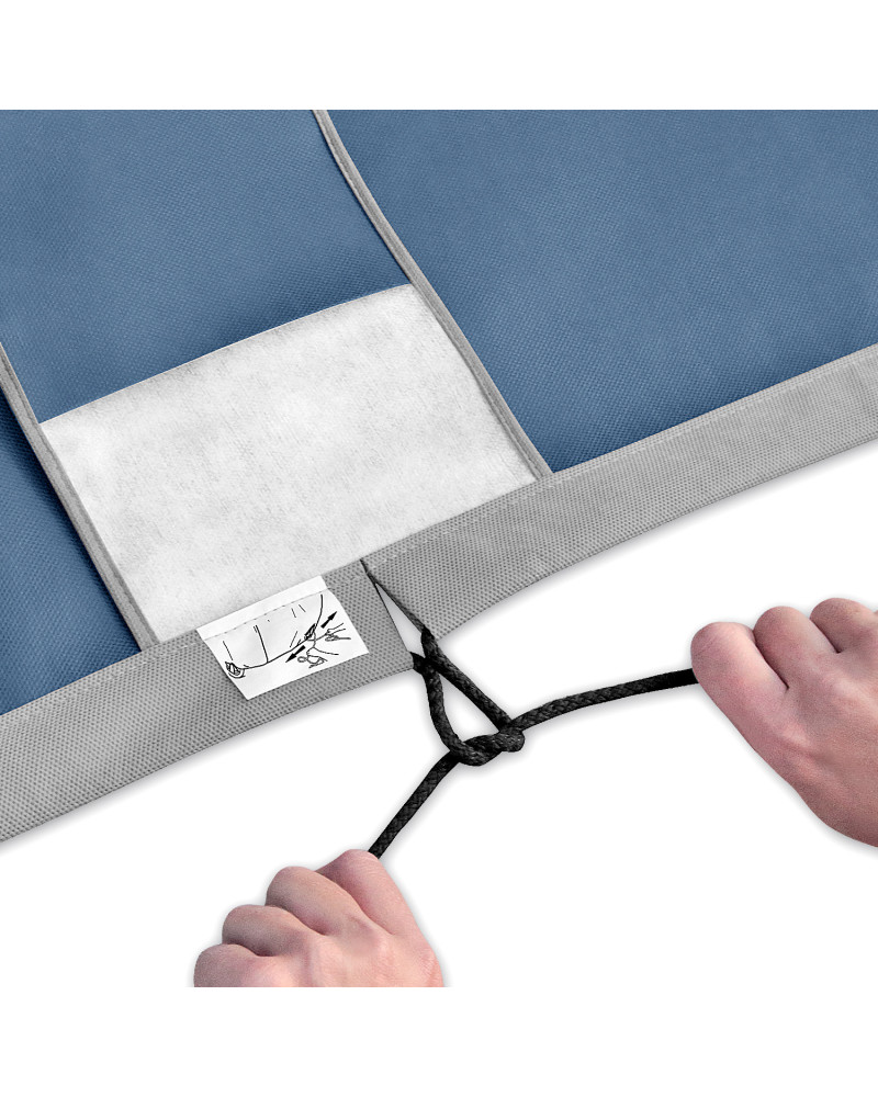 On the outer label of the cover, there is a size marking along with a drawing showing the shape and dimensions of the car for which the cover is intended. Please check that you have purchased the correct size cover for the car on which it will be used. A well-fitting cover with a tightly pulled and tied drawstring can be used safely even in strong winds. If the cover is to be used in very strong winds, it can be additionally secured to the car wheels using the loops sewn into the bottom edge of the cover.