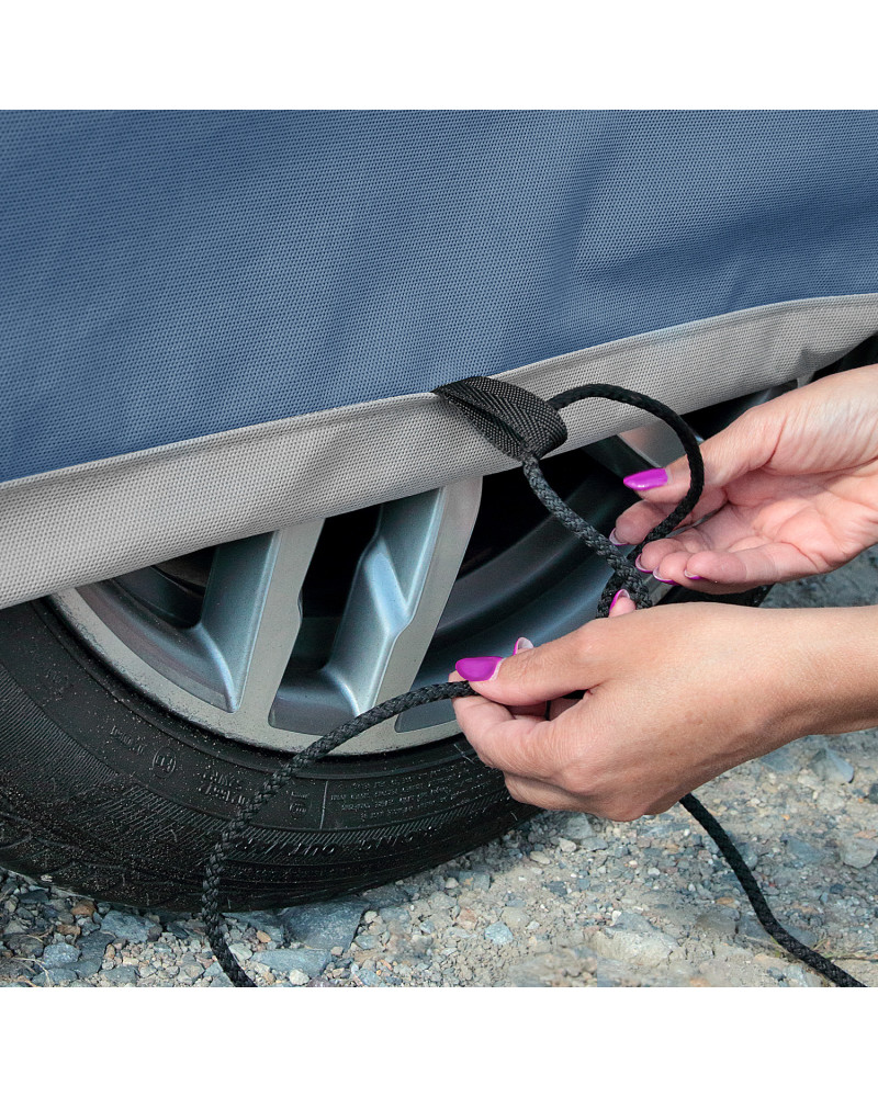 The unique properties of the multi-layer material ensure that the cover does not get wet, while allowing water vapour to escape from under the cover. Any moisture that accumulates under the cover will quickly evaporate, preventing rust and mould from forming on the car. The cover is suitable for both temporary and long-term use. The cover can be hand washed at 40 degrees. The cover is navy blue, which is extremely practical and looks great. The centre of the cover features the manufacturer's name and logo, as well as the name of the material from which it is made, guaranteeing the originality and high quality of the product. The variety of shapes and sizes means that you can choose a cover that fits your car perfectly.