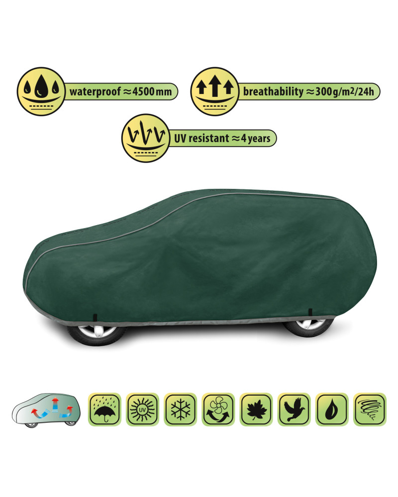 The unique properties of the multi-layer material ensure that the cover is waterproof, while allowing water vapour to escape from under the cover. Any moisture that accumulates under the cover will quickly evaporate, preventing rust and mould from forming on the car. The cover is suitable for both temporary and long-term use.