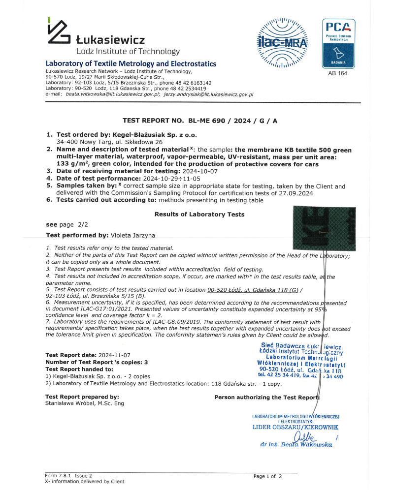 Good tarpaulin covers should not only protect the car from precipitation, pollution and sunlight but should also be safe. These are our Kegel-Błażusiak covers-tarpaulins. Our specialists carry out long-term tests of our covers-tarpaulins. We carry out tests for the effectiveness of protection of the vehicle by the cover-tarpaulin against weather conditions and water resistance, steam evacuation from under the cover, the safety of the cover for the vehicle paint coating and the effectiveness of fastening the cover on the vehicle in normal and extreme weather conditions. Our company Kegel-Błażusiak produces only those products that pass long-term tests.