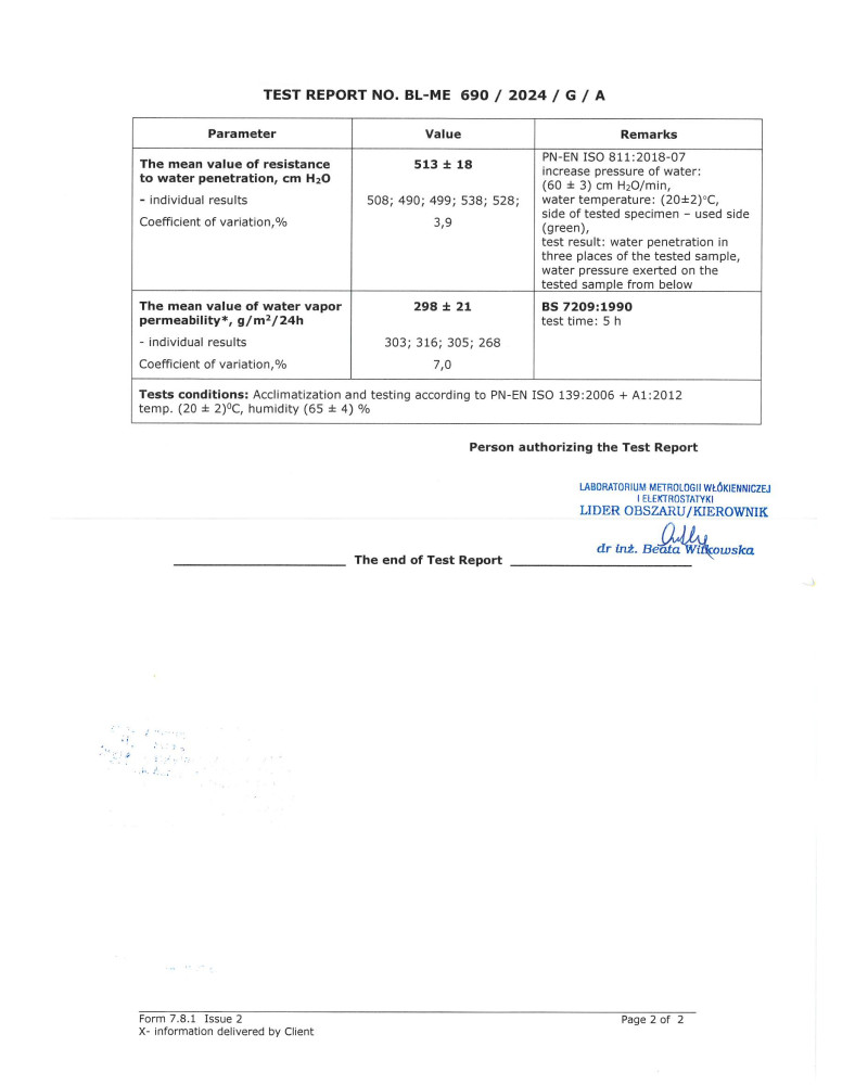 Below is a report on the vapour permeability of the membrane from which we manufacture Garage membrane covers. The test confirms the high vapour permeability and water resistance of the membrane: water vapour transmission through the cover membrane is 291 grams of water vapour per m² of membrane in 24 hours, and the water resistance of the membrane is 4890 mm of water column.
