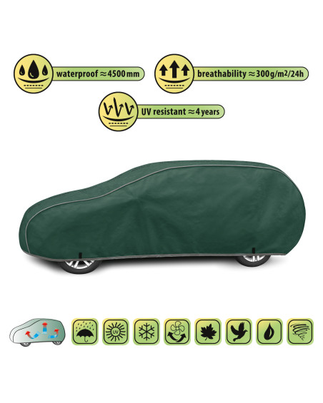 The unique properties of the multi-layer material ensure that the cover is waterproof, while allowing water vapour to escape from under the cover. Any moisture that accumulates under the cover will quickly evaporate, preventing rust and mould from forming on the car. The cover is suitable for both temporary and long-term use.
