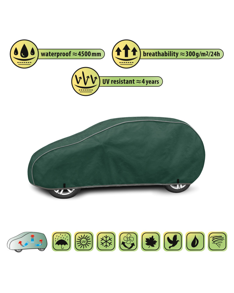 The unique properties of the multi-layer material ensure that the cover is waterproof, while allowing water vapour to escape from under the cover. Any moisture that accumulates under the cover will quickly evaporate, preventing rust and mould from forming on the car. The cover is suitable for both temporary and long-term use.