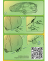 Before fitting the cover to the car, fold down the side mirrors and fold or unscrew the aerial. Place the cover on a clean and dry car with the printed side facing outwards. To facilitate the right positioning of the cover on the vehicle, the label marked “ FRONT” has been sewn into the cover on the front and the label marked “REAR” into the back of the cover (the markings correspond to the front and back of the vehicle)