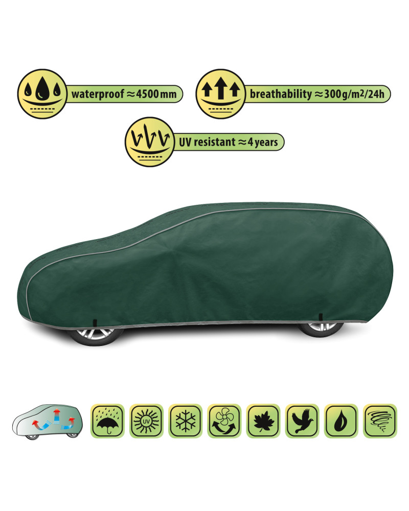 The unique properties of the multi-layer material ensure that the cover is waterproof, while allowing water vapour to escape from under the cover. Any moisture that accumulates under the cover will quickly evaporate, preventing rust and mould from forming on the car. The cover is suitable for both temporary and long-term use.