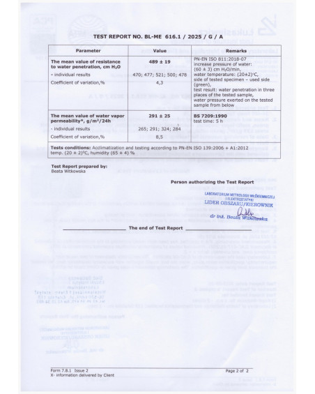 Below is a report on the vapour permeability of the membrane from which we manufacture Garage membrane covers. The test confirms the high vapour permeability and water resistance of the membrane: water vapour transmission through the cover membrane is 291 grams of water vapour per m² of membrane in 24 hours, and the water resistance of the membrane is 4890 mm of water column.