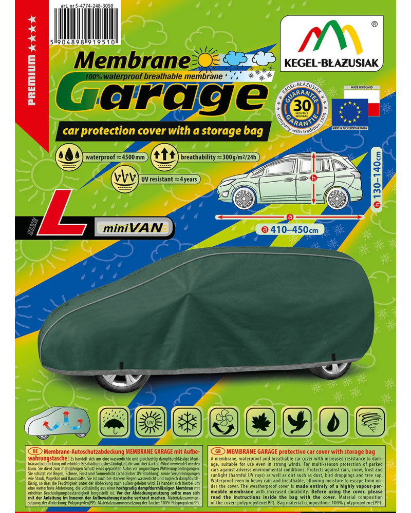 The high-quality Membrane Garage cover is a product tailored to the needs of drivers. The cover is made entirely of 4-layer material, which is thick, strong and durable. The cover protects the entire car from harmful environmental influences. The Membrane Garage cover provides adequate protection for your vehicle throughout the year. Its functionality can be appreciated in every season. In winter, it prevents snow, frost and ice from settling and is resistant to freezing; in autumn, it protects against rain, wind, leaves and tree sap; and in summer and spring, it protects against UV rays, dust and bird droppings.