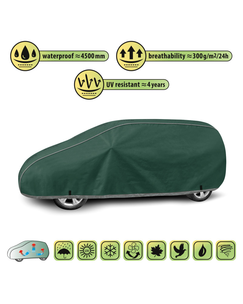 The unique properties of the multi-layer material ensure that the cover is waterproof, while allowing water vapour to escape from under the cover. Any moisture that accumulates under the cover will quickly evaporate, preventing rust and mould from forming on the car. The cover is suitable for both temporary and long-term use.