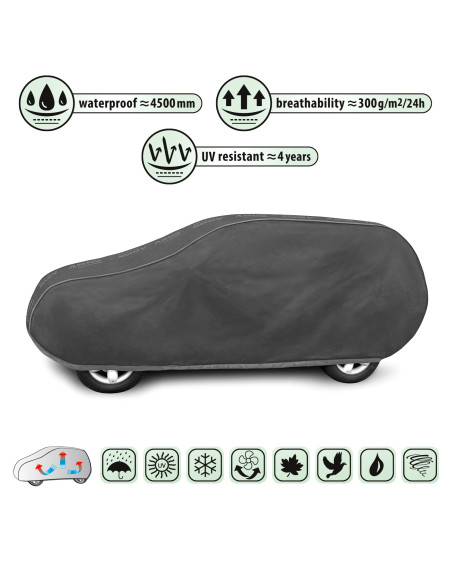 A membrane, waterproof and vapour-permeable car cover. Waterproof even during heavy rain and vapour-permeable, wicking moisture away from under the cover. Weather-resistant cover made entirely of a highly vapour-permeable membrane. It protects against rain, snow, frost and sunlight (harmful UV rays) as well as contaminants such as dust, bird droppings and tree sap.