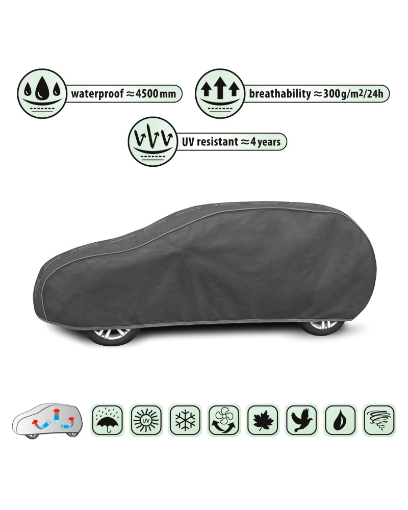 A membrane, waterproof and vapour-permeable car cover. Waterproof even during heavy rain and vapour-permeable, wicking moisture away from under the cover. Weather-resistant cover made entirely of a highly vapour-permeable membrane. It protects against rain, snow, frost and sunlight (harmful UV rays) as well as contaminants such as dust, bird droppings and tree sap.