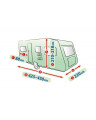 Put the cover on a clean and dry caravan with the printed side facing outwards. To fit the cover without the use of a ladder, you will need two people with two strong poles (poles not included with the cover) about 1.5 metres or more in length depending on the height of the caravan. First lay out a large sheet of clean cloth or foil behind the caravan to protect the cover from dirt. Place the cover on the sheet behind the caravan, laying it in the same direction as the caravan. To facilitate correct positioning, a label marked „FRONT” has been sewn on the front of the cover and the one marked „BACK” on the back of the cover (the markings correspond with the front and back sides of the caravan). Pole holders have been sewn into the lower front corners of the cover in the form of pockets into which the poles must be inserted. Using the poles inserted in the pocket holders, two people should lift the cover over the back of the caravan and then pull the cover over the roof of the caravan moving forward along the whole length of the caravan (one person on the left side, the other on the right side of the caravan) ending up at the front of the caravan, in effect pulling the cover over the entire vehicle. Next, tighten and tie the lower cord of the cover, taking care to cross the cords to form the first knot, then tighten the cords firmly, directing the forces parallel to the front edge of the caravan. Tie the turnbuckle cords and check that the knot does not loosen when the turnbuckle is pulled. If the knot loosens, repeat the operation by changing the tying method. The lower edge of the cover has lashing straps sewn into it, all of which must be threaded under the caravan through the nearest holes in the caravan’s substructure for each strap, then the straps must be buckled and tightened.