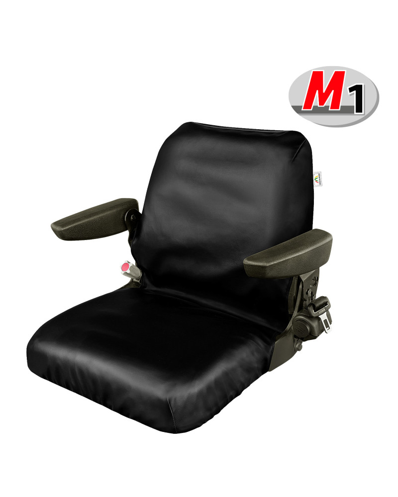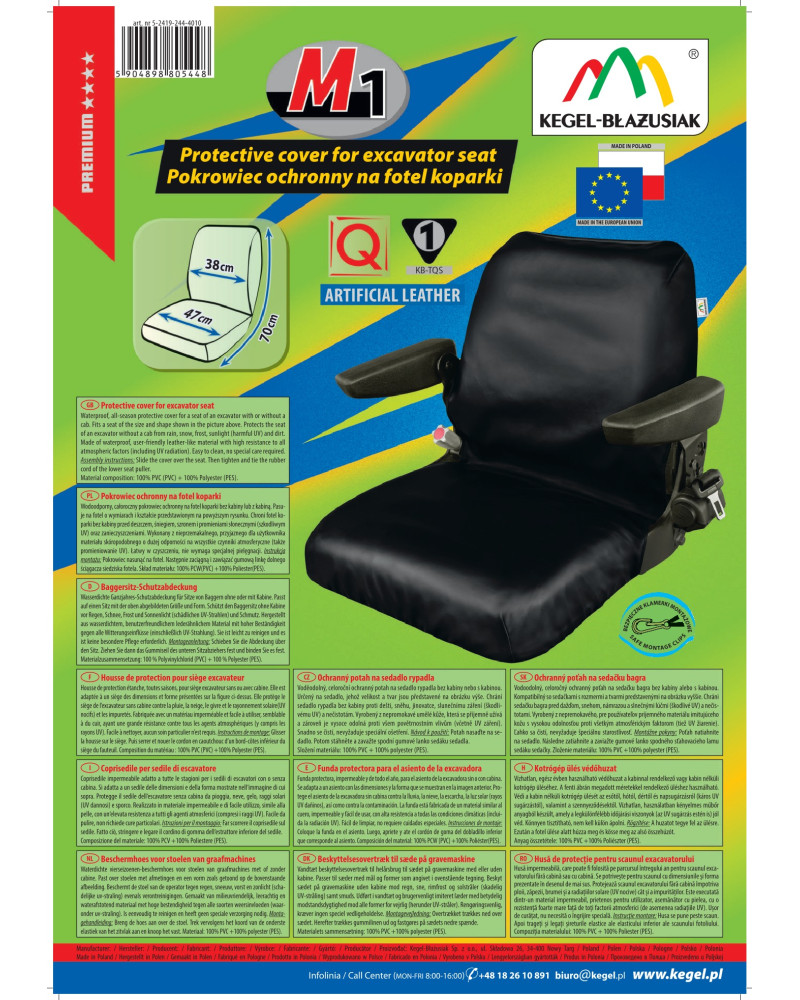 Waterproof, all-season protective cover for a seat of an excavator with or without a cab. Fits a seat of the size and shape shown in the picture above. Protects the seat of an excavator without a cab from rain, snow, frost, sunlight (harmful UV) and dirt. Made of waterproof, user-friendly leather-like material with high resistance to all atmospheric factors (including UV radiation). Easy to clean, no special care required.