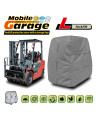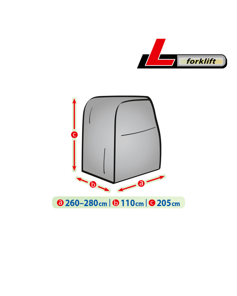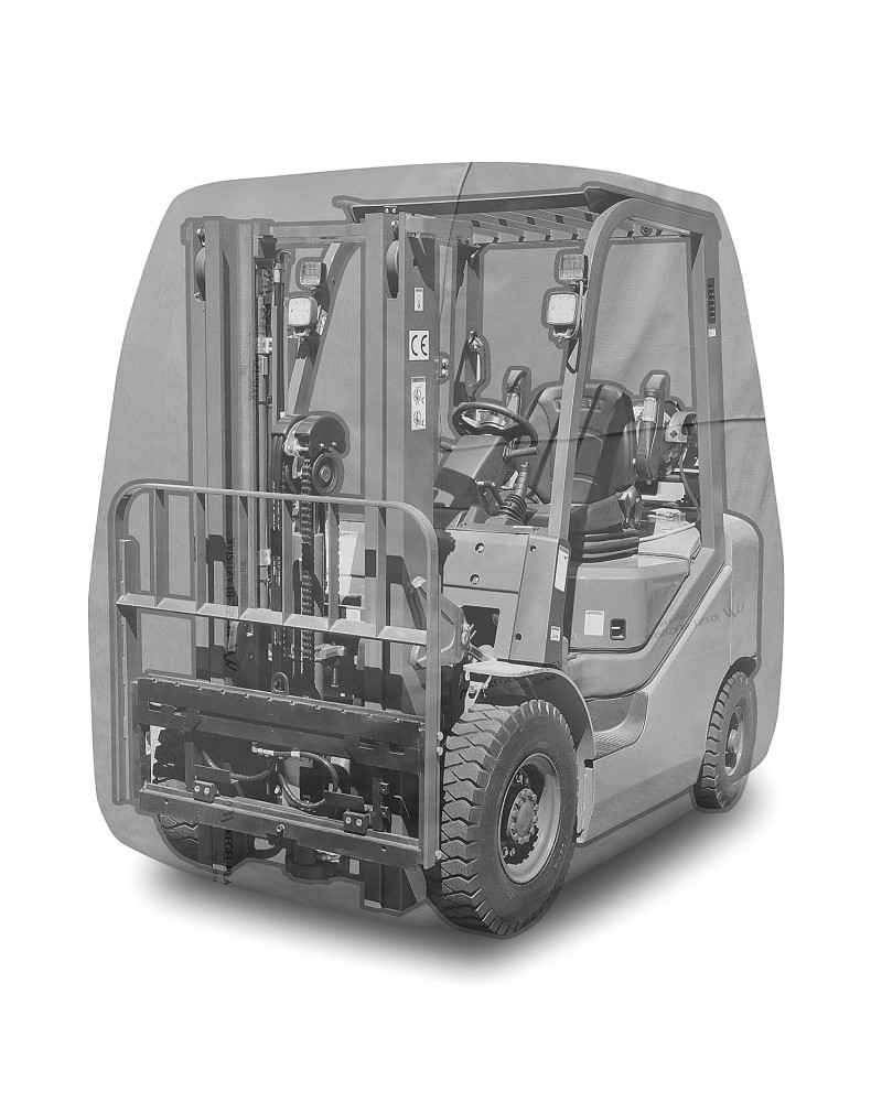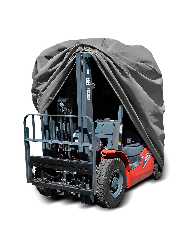 Waterproof cover to protect a forklift stored outdoors from adverse environmental influences. Also suitable for indoor use. Protects against rain, snow, frost and sunlight (harmful UV rays) as well as contaminants such as dust, bird droppings and tree sap. Waterproof and "breathable" membrane cover that draws moisture out from under the cover.