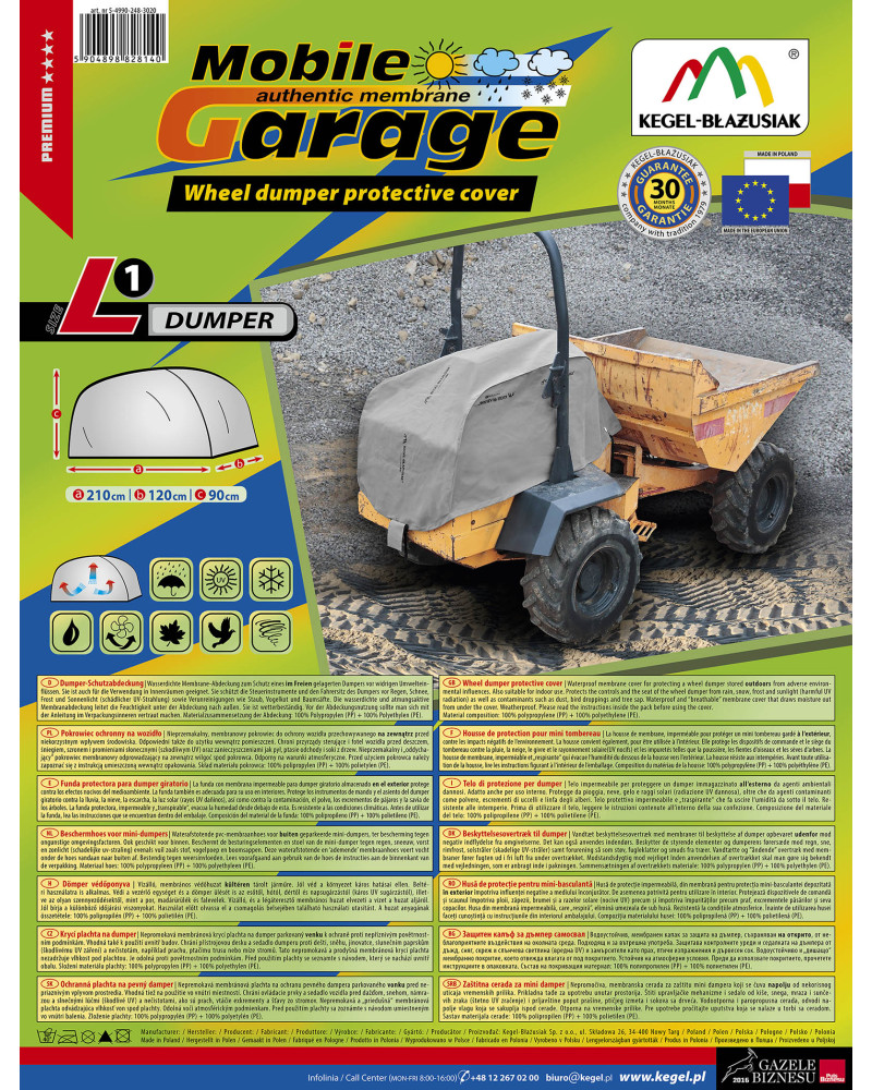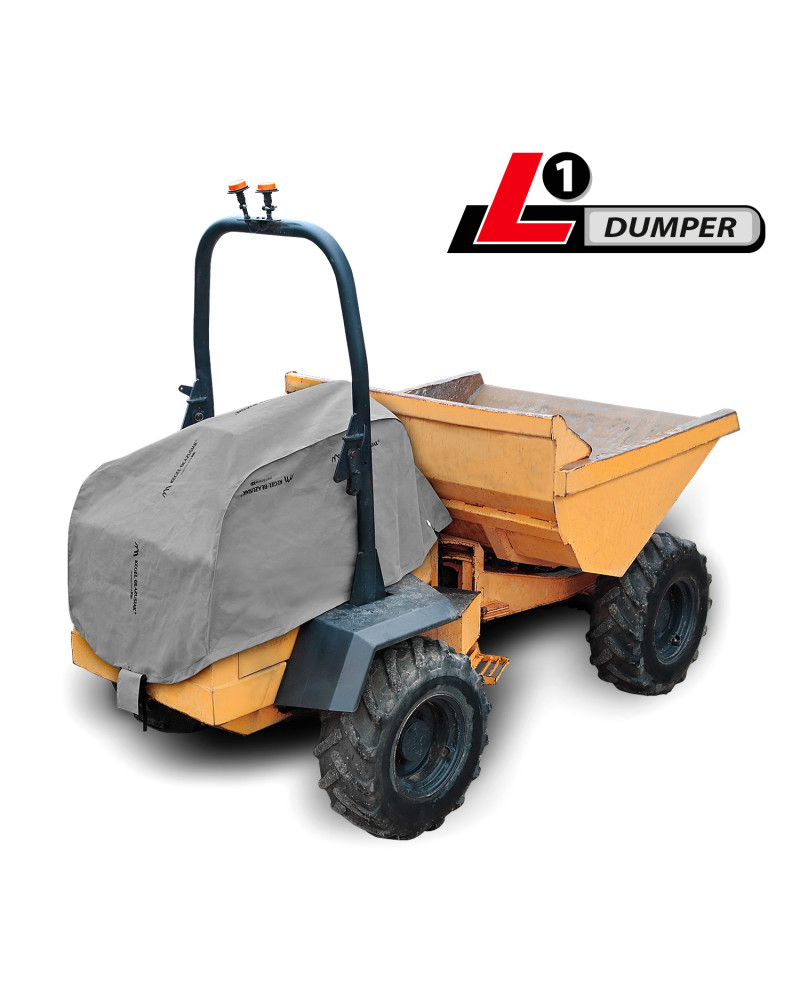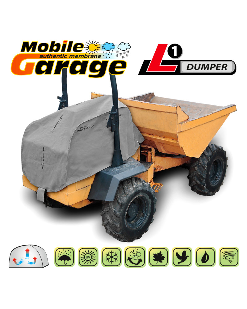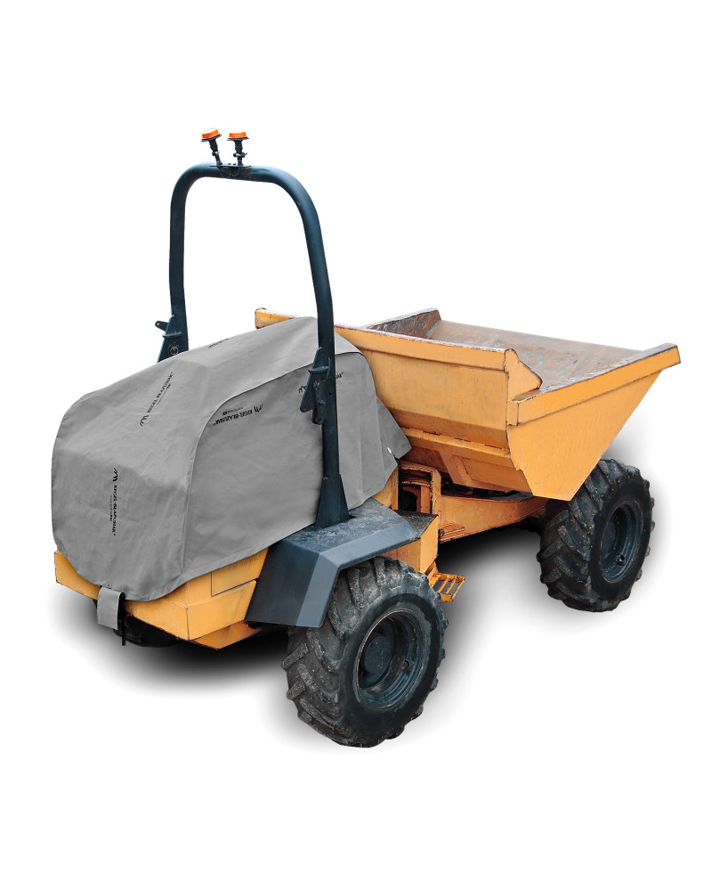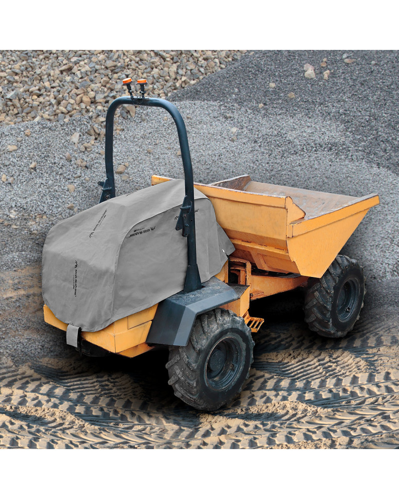 Waterproof cover to protect a dumper stored outdoors from adverse environmental influences. Also suitable for indoor use. Protects against rain, snow, frost and sunlight (harmful UV rays) as well as contaminants such as dust, bird droppings and tree sap. Waterproof and "breathable" membrane cover that draws moisture out from under the cover.