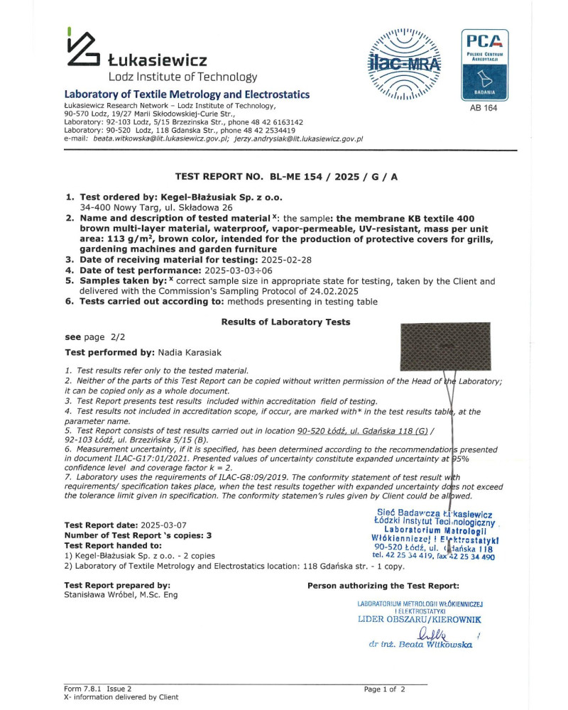 Below is a report on the vapour permeability of the membrane from which we manufacture Optimal Garage covers. The tests were carried out in an independent, accredited testing laboratory. The test confirms the high vapour permeability of the membrane and the penetration of water vapour through the cover membrane at a horizontal level. vapour permeability of the membrane and water vapour transmission through the cover membrane at a level of 314 grams of water vapour per m² of membrane in 24 hours.