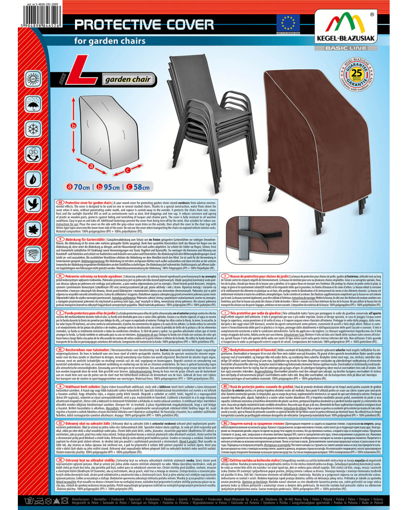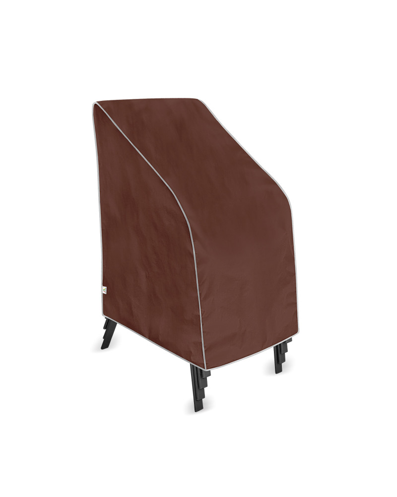 A year-round cover for protecting garden chairs stored outdoors from adverse environmental effects. The cover is designed to be used on one or several stacked chairs. Thanks to a special construction, water flows down the cover when it rains, without penetrating under neath, and vapour is carried away to the outside. It protects the chairs from rain, snow, frost and the sunlight (harmful UV) as well as contaminants such as dust, bird droppings and tree sap. It reduces corrosion and ageing of plastic or wooden parts, protects against fading and tarnishing of lacquer and chrome parts.