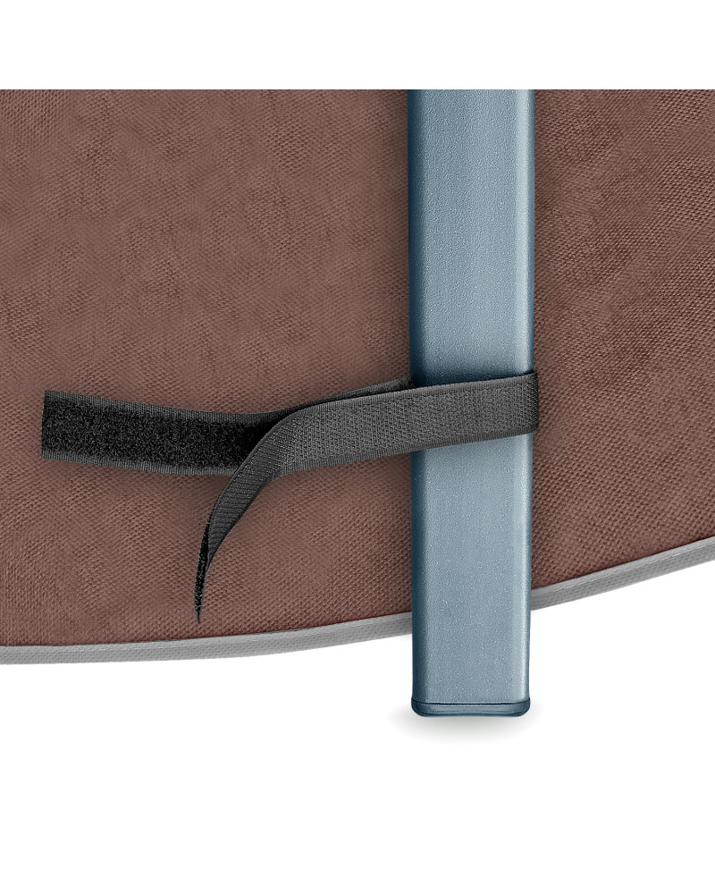 Place the cover on a folding chair with grey-colour seam trims side on the outside, then attach the cover to the chair legs with Velcro-type straps sewn into the lower inner side of the cover. Do not use the cover when transporting the chair on exposed exterior vehicle racks.