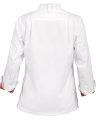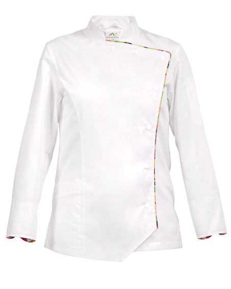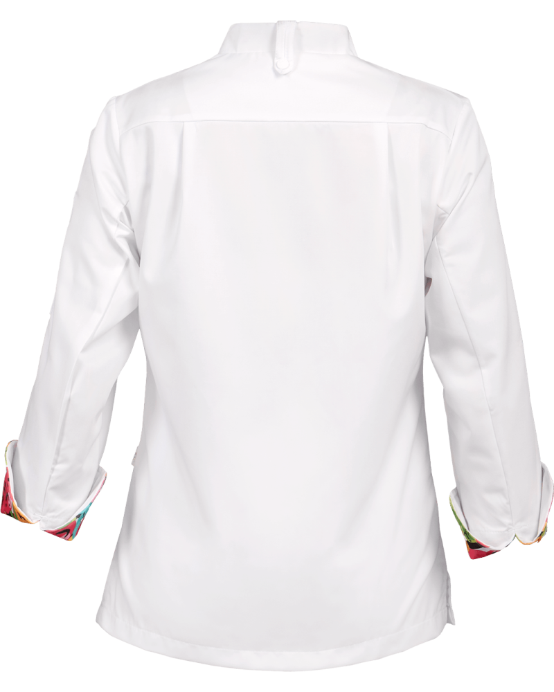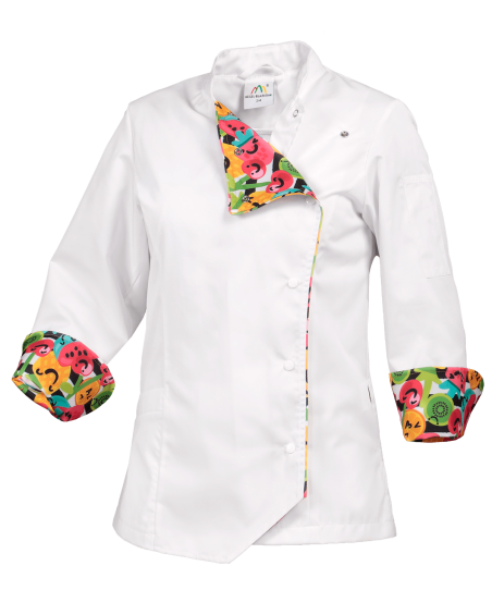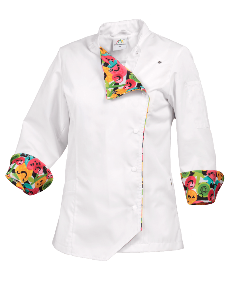 Elegancka bluza kucharska 360A uszyta, zaprojektowana dla każdej szefowej kuchni ceniącej sobie niepowtarzalność i nowoczesny design. Bluza w kolorze białym delikatnie podkreślająca swoją wyjątkowość kontrastową wypustką oraz zaokrąglonymi mankietami w jasnym kolorze (wzór przedstawiający owoce). Tkanina Kb Textil, z której bluza jest uszyta, gwarantuję zachowanie koloru po wielokrotnym praniu, odporność na większe zabrudzenia i wytrzymałość na długie lata. Wygodę i bezpieczeństwo zapewnia technologia wykorzystana podczas produkcji. Dodatkowo bluzę wyróżniają cięcia modelujące z przodu doskonale podkreślające sylwetkę i praktyczna kieszeń na rękawie z przegródkami.