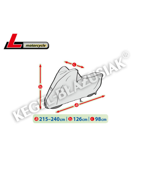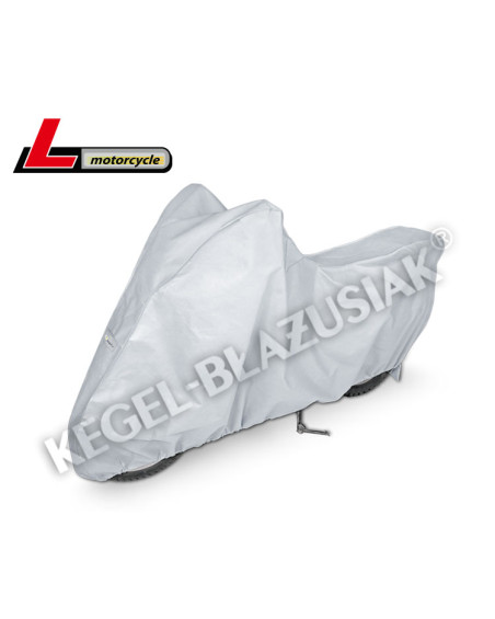 Membranowy, nieprzemakalny i jednocześnie paroprzepuszczalny pokrowiec do ochrony motocykla spalinowego lub elektrycznego przed niekorzystnym wpływem środowiska. Odporny na warunki atmosferyczne pokrowiec wykonany w całości z membrany wysokoparoprzepuszczalnej. Nieprzemakalny nawet podczas intensywnego deszczu i jednocześnie paroprzepuszczalny, odprowadzający na zewnątrz wilgoć spod pokrowca. Chroni przed deszczem, śniegiem, szronem i promieniami słonecznymi (szkodliwym UV) oraz zanieczyszczeniami jak pył, ptasie odchody i soki z drzew. Ogranicza korozję i starzenie się elementów z tworzyw sztucznych, chroni przed blaknięciem i matowieniem lakieru oraz elementów chromowanych. Odpowiedni do długo lub krótkookresowego przechowywania na zewnątrz pomieszczeń motocykla spalinowego lub krótkookresowego przechowywania motocykla elektrycznego. Odpowiedni także do użytku wewnątrz pomieszczeń. Ściągacz z linką i dodatkowe zapięcia pod motocyklem zabezpieczają pokrowiec przed zerwaniem przez wiatr.