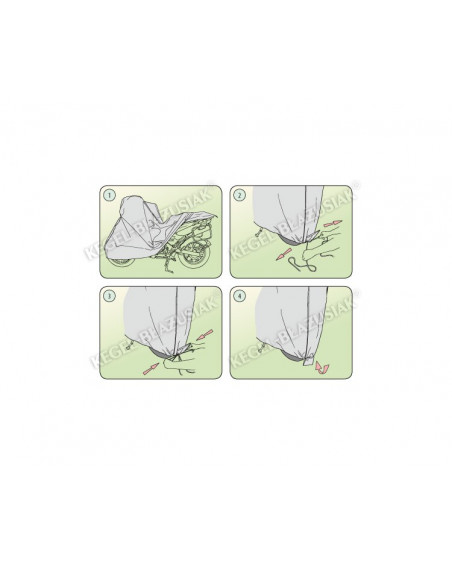 Pokrowiec założyć na czysty motocykl czarną stroną pasa pokrowca od wewnątrz. Następnie maksymalnie mocno zaciagnąć linkę ściągacza pokrowca i pewnie ją zawiązać.