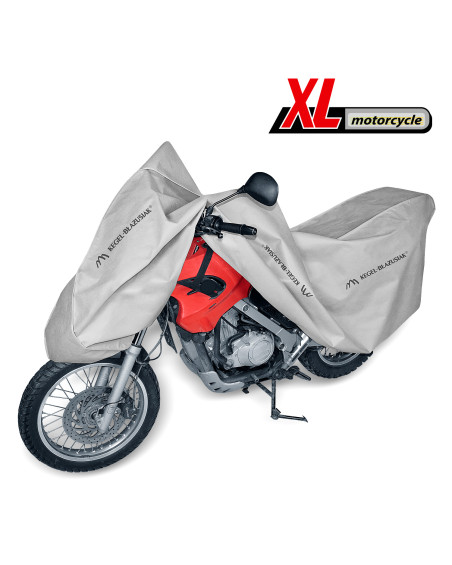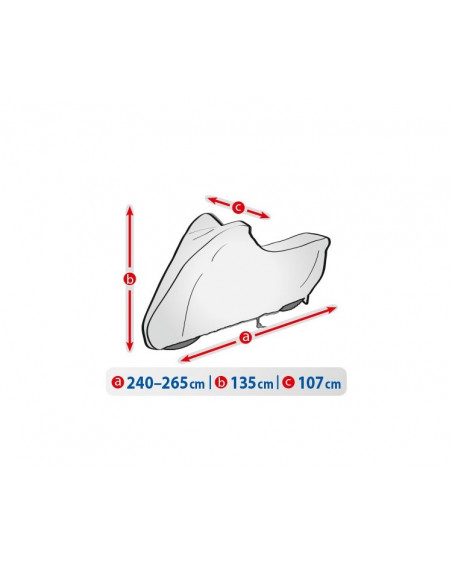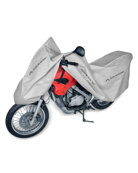 Membranowy, nieprzemakalny i jednocześnie paroprzepuszczalny pokrowiec do ochrony motocykla spalinowego lub elektrycznego przed niekorzystnym wpływem środowiska. Odporny na warunki atmosferyczne pokrowiec wykonany w całości z membrany wysokoparoprzepuszczalnej. Nieprzemakalny nawet podczas intensywnego deszczu i jednocześnie paroprzepuszczalny, odprowadzający na zewnątrz wilgoć spod pokrowca. Chroni przed deszczem, śniegiem, szronem i promieniami słonecznymi (szkodliwym UV) oraz zanieczyszczeniami jak pył, ptasie odchody i soki z drzew. Ogranicza korozję i starzenie się elementów z tworzyw sztucznych, chroni przed blaknięciem i matowieniem lakieru oraz elementów chromowanych. Odpowiedni do długo lub krótkookresowego przechowywania na zewnątrz pomieszczeń motocykla spalinowego lub krótkookresowego przechowywania motocykla elektrycznego. Odpowiedni także do użytku wewnątrz pomieszczeń. Ściągacz z linką i dodatkowe zapięcia pod motocyklem zabezpieczają pokrowiec przed zerwaniem przez wiatr.