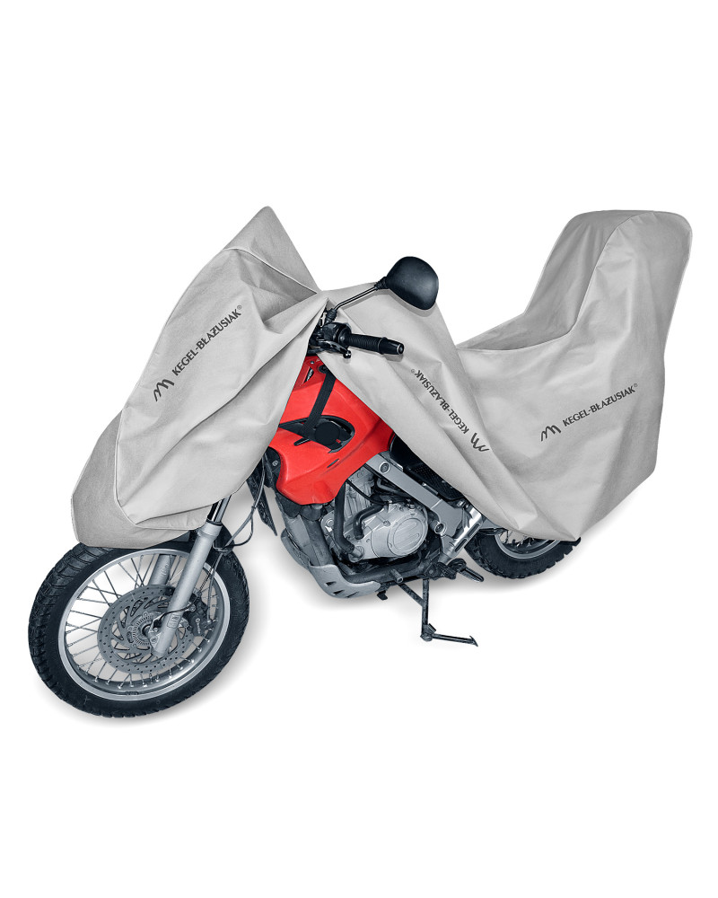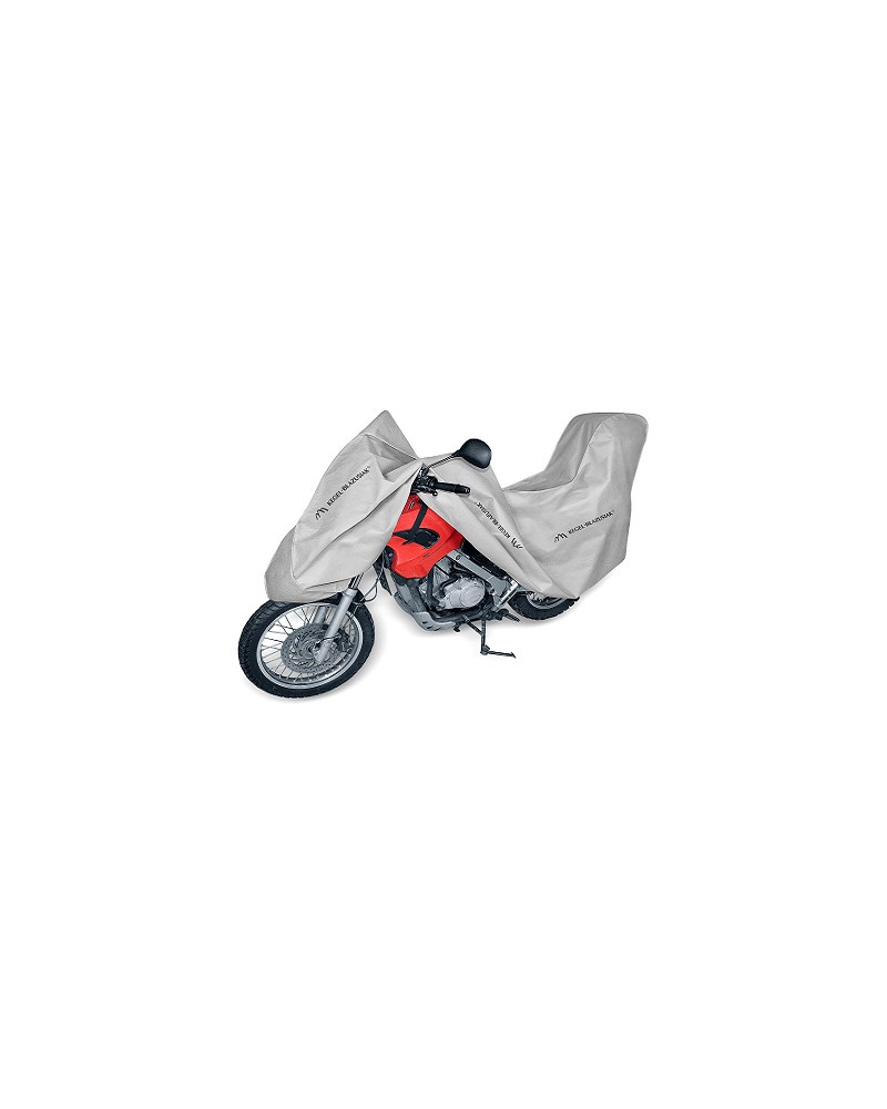 A membrane-based, waterproof and at the same time vapour-permeable cover to protect your combustion or electric motorcycle from adverse environmental influences. Weatherproof cover made entirely of a highly vapour-permeable membrane. Waterproof even in heavy rain and at the same time vapour-permeable, wicking away moisture from under the cover. Protects against rain, snow, frost and sunlight (harmful UV) as well as contaminants such as dust, bird droppings and tree sap. Reduces corrosion and ageing of plastic parts, protects against fading and tarnishing of paintwork and chrome parts. Suitable for long or short-term outdoor storage of a combustion motorcycle or short-term storage of an electric motorcycle. Also suitable for indoor use. A drawstring and additional fasteners underneath the motorcycle protect the cover from being ripped off by wind. Holes in the cover allow the motorcycle to be attached by the front wheel with the cover using a lock or chain.