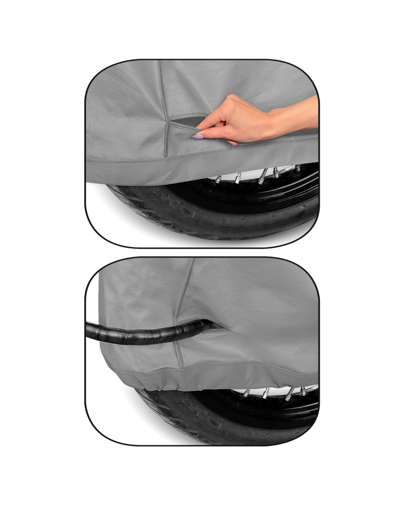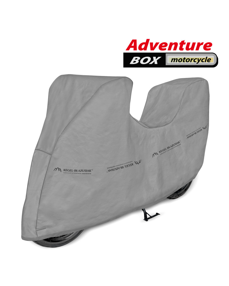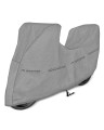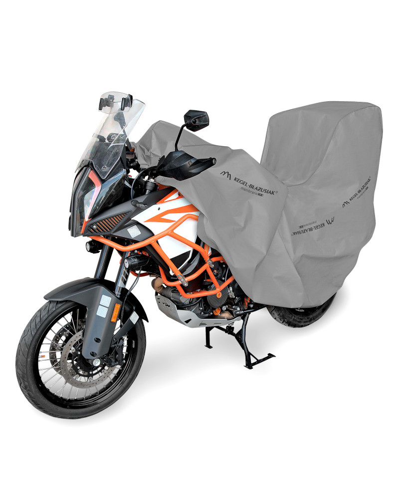 A membrane-based, waterproof and at the same time vapour-permeable cover to protect your combustion or electric motorcycle from adverse environmental influences. Weatherproof cover made entirely of a highly vapour-permeable membrane. Waterproof even in heavy rain and at the same time vapour-permeable, wicking away moisture from under the cover. Protects against rain, snow, frost and sunlight (harmful UV) as well as contaminants such as dust, bird droppings and tree sap. Reduces corrosion and ageing of plastic parts, protects against fading and tarnishing of paintwork and chrome parts. Suitable for long or short-term outdoor storage of a combustion motorcycle or short-term storage of an electric motorcycle. Also suitable for indoor use. A drawstring and additional fasteners underneath the motorcycle protect the cover from being ripped off by wind. Holes in the cover allow the motorcycle to be attached by the front wheel with the cover using a lock or chain.