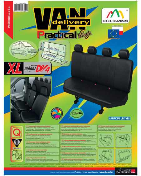 Nieprzemakalny, niebrudzący i niezwykle wytrzymały materiał zapewnia praktyczny użytek. Oferta skierowana do właścicieli samochodów dostawczych i mikrobusów, którzy chcą zadbać o wnętrze swoich pojazdów oraz dodać im szyku i elegancji. Czarna, uniwersalna kolorystyka idealnie dopasowuje się do wnętrza każdego pojazdu. Pokrowce świetnie prezentują się w każdym samochodzie. Są wyjątkowo eleganckie, dlatego też dzięki nim każde wnętrze nabierze klasy i wdzięku. Pokrowce wyposażone są w niezbędne, zapinane otwory umożliwiające założenie pokrowca bez konieczności wyciągania zagłówków i wykonywania dodatkowych otworów. Przy produkcji zostały uwzględnione również inne elementy konstrukcyjne kanapy. Komplet wyposażony jest w specjalne klamerki montażowe, a do materiału wszyte są mocowania, dlatego tez bardzo łatwo go założyć. Wszelkie zabrudzenia pokrowca, są bardzo łatwe do usunięcia- wystarczy przetrzeć je wilgotną ścierką.