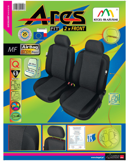 Pokrowce dopasowane ARES zostały wykonane z wysokogatunkowego materiału żakardowego, co w połączeniu ze starannością wykończenia nawet najdrobniejszych detali, zadowoli najbardziej wymagających klientów. Dzięki odpowiedniej budowie, pokrowce dobrze dopasowują się do siedzeń, a podlaminowanie po wewnętrznej stronie całego materiału trudnopalną pianką PUR, zapobiega ich przesuwaniu. Oferta skierowana do właścicieli samochodów osobowych, którzy chcą zadbać o wnętrza swoich pojazdów oraz dodać im szyku i elegancji. Pokrowce samochodowe ARES bardzo dobrze chronią oryginalną tapicerkę samochodu przed przecieraniem i zniszczeniem, a gustowna, klasyczna stylistyka wywołuje pozytywne wrażenia estetyczne. Stonowana kolorystyka- czerń wraz z delikatną szarą fakturą idealnie wkomponuje się do wnętrza każdego samochodu. Dzięki odpowiedniej, przestrzennej budowie pokrowce dobrze dopasowują się do foteli. Materiał idealnie przylega do foteli, zastępując ich właściwą tapicerkę. Dokładnie z takich materiałów wykonywane są oryginalne poszycia foteli nowych pojazdów dla fabryk samochodowych. Zaletą pokrowców ARES jest to, że zakrywają całą tylną powierzchnię oparcia. Ta właściwość sprawia, że bardzo dobrze prezentują się także z tyłu fotela, jednocześnie chroniąc go przed zabrudzeniami i uszkodzeniami (ważne jest to szczególnie dla osób posiadających małe dzieci). Profesjonalne wykonanie z materiałów wysokiej jakości gwarantuje długi czas użytkowania.