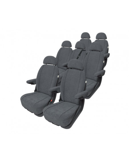 Pokrowce wykonane są, z grubego, mocnego i sprawdzonego materiału w bardzo praktycznym i neutralnym kolorze nawiązującym do fabrycznych poszyć foteli, z niemal 100% trwałością barw. Materiał idealnie przylega do foteli, zastępując ich właściwą tapicerkę. Dokładnie z takich materiałów wykonywane są oryginalne poszycia foteli nowych pojazdów dla fabryk samochodowych. Stonowana kolorystyka w odcieniach popielu, idealnie wkomponuje się do wnętrza każdego samochodu. Oferta skierowana do właścicieli mini vanów, którzy chcą zadbać o wnętrza swoich pojazdów oraz dodać im szyku i elegancji. Pokrowce bardzo dobrze chronią oryginalną tapicerkę samochodu przed przecieraniem i zniszczeniem, a gustowna, klasyczna stylistyka wywołuje pozytywne wrażenia estetyczne.
