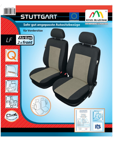 Pokrowce STUTTGART są bardzo łatwe w montażu- szybko się je zakłada, dzięki zapinanym na rzepę otworom, pozwalającym na założenie ich bez konieczności wyciągania zagłówków, a następnie mocuje za pomocą wszytych gumowych uchwytów oraz bezpiecznych, plastikowych klamerek montażowych. Tylna powierzchnia pokrowców jest zabudowana, dzięki czemu chroniony jest także tył siedzeń (ważna cecha dla posiadaczy małych dzieci). Pokrowce łatwo utrzymać w czystości, gdyż można je wyprać zgodnie z informacją na metce- w temperaturze 40°. Produkt serii BASIC LINE, której hasłem przewodnim jest – bardzo dobra jakość w przystępnej cenie. Produkowany z dobrej jakości surowców . Pokrowce tej marki spełniają wszelkie normy wytrzymałościowe i jakościowe. Ich staranne wykonanie z dobrych materiałów, doskonale sprawdza się w branży samochodowej.