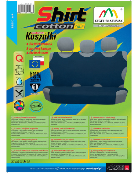 Naturalna bawełna z wierzchniej strony sprawia, że pokrowce są bardzo przyjemne i przyjazne dla ciała, nie elektryzują się. Ponadto dzianina bawełniana, farbowana jest nowoczesnymi metodami przy użyciu barwników renomowanych producentów, co sprawia, że w stosunku do innych produktów wykonanych z bawełny cechuje się zwiększoną odpornością na utratę kolorów pod wpływem słońca i na skutek prania. Pokrowce można bez obaw prać w temperaturze 40° - zgodnie z zaleceniami na opakowaniu. Pokrowce koszulki posiadają też niezbędne, odpowiedniej wielkości otwory, umożliwiające założenie pokrowca bez konieczności wyciągania zagłówków i wykonywania dodatkowych otworów. Komplet wyposażony jest w specjalne plastikowe klamerki, a do materiału wszyte są mocowania, co przy pomocy dołączonej obrazkowej instrukcji obsługi zapewnia bardzo łatwy montaż. Produkt serii BASIC LINE, której hasłem przewodnim jest – bardzo dobra jakość w przystępnej cenie. Produkowany z dobrej jakości surowców . Pokrowce tej marki spełniają wszelkie normy wytrzymałościowe i jakościowe. Ich staranne wykonanie z dobrych materiałów, doskonale sprawdza się w branży samochodowej.
