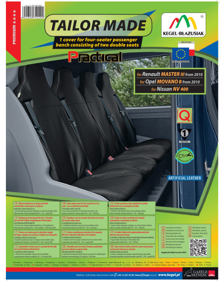 Oferta skierowana do właścicieli samochodów dostawczych i mikrobusów, którzy chcą zadbać o wnętrze swoich pojazdów oraz dodać im szyku i elegancji. Czarna, uniwersalna kolorystyka idealnie dopasowuje się do wnętrza każdego pojazdu. Pokrowce świetnie prezentują się w każdym samochodzie. Są wyjątkowo eleganckie, dlatego też dzięki nim każde wnętrze nabierze klasy i wdzięku. Pokrowce wyposażone są w niezbędne, zapinane otwory umożliwiające założenie pokrowca bez konieczności wyciągania zagłówków i wykonywania dodatkowych otworów. Przy produkcji zostały uwzględnione również inne elementy konstrukcyjne kanapy. Komplet wyposażony jest w specjalne klamerki montażowe, a do materiału wszyte są mocowania, dlatego tez bardzo łatwo go założyć. Wszelkie zabrudzenia pokrowca, są bardzo łatwe do usunięcia- wystarczy przetrzeć je wilgotną ścierką. Produkt renomowanej firmy Kegel-Błażusiak. Największego producenta i eksportera w branży pokrowców samochodowych i odzieży roboczej. Lata doświadczenia i coraz bardziej doskonały asortyment sprawiają, że pokrowce tejże marki można określić mianem najlepszych w Polsce. Produkowany w Polsce, głównie z polskich surowców z zachowaniem wszystkich standardów jakościowych Unii Europejskiej. Kupując pokrowce Kegel-Błażusiak wspierasz polską gospodarkę i chronisz polskie miejsca pracy.