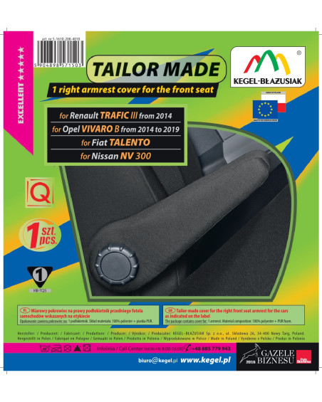 - Wyposażone w specjalne zapinane na rzepę rozcięcie, umożliwiające wyciągnięcie podłokietnika w pokrowcu na fotel dla kierowcy zarówno z prawej jak i lewej strony (wersja angielska)