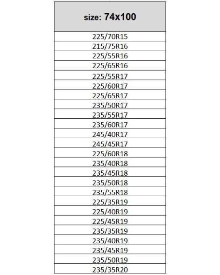 Pasuje na koła o rozmiarze: 205/70R15, 215/65R15, 215/70R15, 195/65R16, 195/75R16, 205/65R16, 205/75R16, 215/60R16, 215/65R16, 215/70R1, 205/55R17, 215/55R17, 215/60R17, 215/65R17, 235/45R17, 215/50R18, 215/55R18, 225/40R18, 225/45R18, 225/50R18, 225/55R18, 205/55R19, 215/50R19.