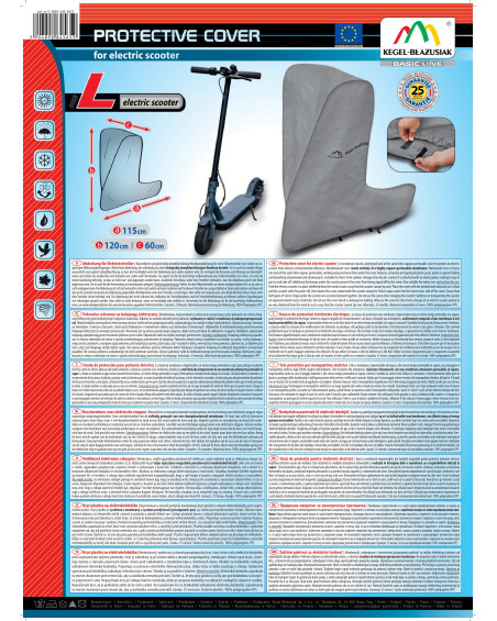 Hulajnogę elektryczną zaparkować w miejscu osłoniętym od wiatru w sposób uniemożliwiający przewrócenie się hulajnogi. Pokrowiec założyć stroną z nadrukiem na zewnątrz na czystą i suchą hulajnogę z wyłączonym zasilaniem, a następnie spiąć pokrowiec pod hulajnogą za pomocą taśm typu „rzep” wszytych w dolną, wewnętrzną stronę pokrowca. Upewnić się, że obydwie pary taśm „rzep” pod hulajnogą zostały dobrze spięte. Nie używać pokrowca podczas ładowania baterii hulajnogi i transportu hulajnogi na odkrytych bagażnikach zewnętrznych pojazdów. Nie używać pokrowca uszkodzonego lub jeżeli pokrowiec przecieka. Używać pokrowiec tylko do krótkookresowego przechowywania hulajnogi elektrycznej zaparkowanej w miejscu osłoniętym od wiatru w sposób uniemożliwiający przewrócenie się hulajnogi.